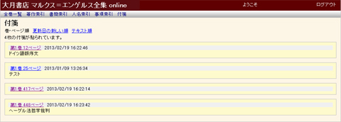 付箋は会員登録者毎に管理されていますので、自分が付けた付箋を、「マルクス=エンゲルス全集WEB版」ログイン時にいつでも参照、該当する本文画像をすぐに見ることができます。